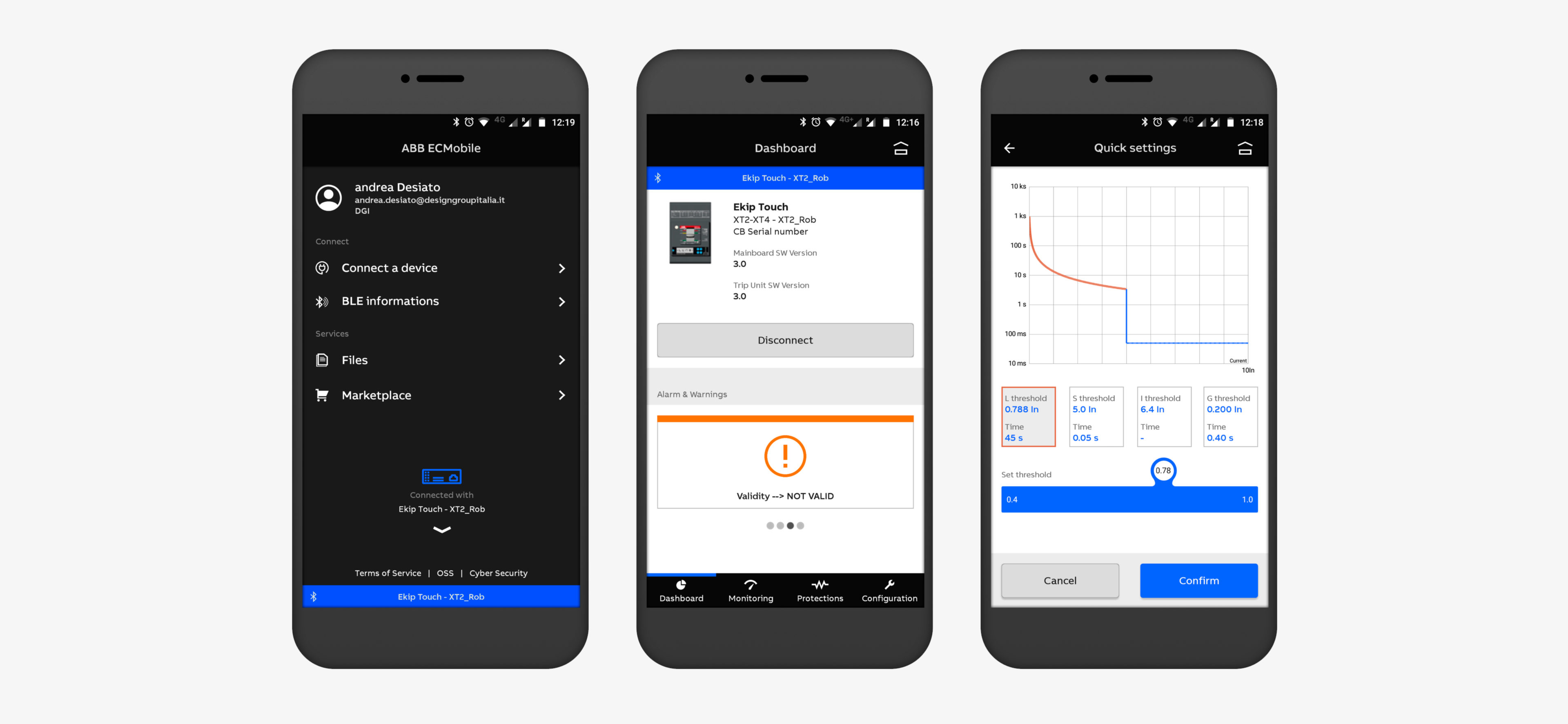 For 30 years, ABB, a leading global technology company with more than 100,000 employees across over 100 countries, has partnered with Design Group Italia for support with product design, engineering and digital products. With the arrival of EPIC Mobile, an application monitoring and controlling industrial circuit breakers, they reached out to us once more for a digital transformation, employing innovative UX design to connect the app directly to a breaker via BLE technology. With this, the user can set up all parameters, protection thresholds and access to diagnostics, even keeping track of events, alarms and trip units.
