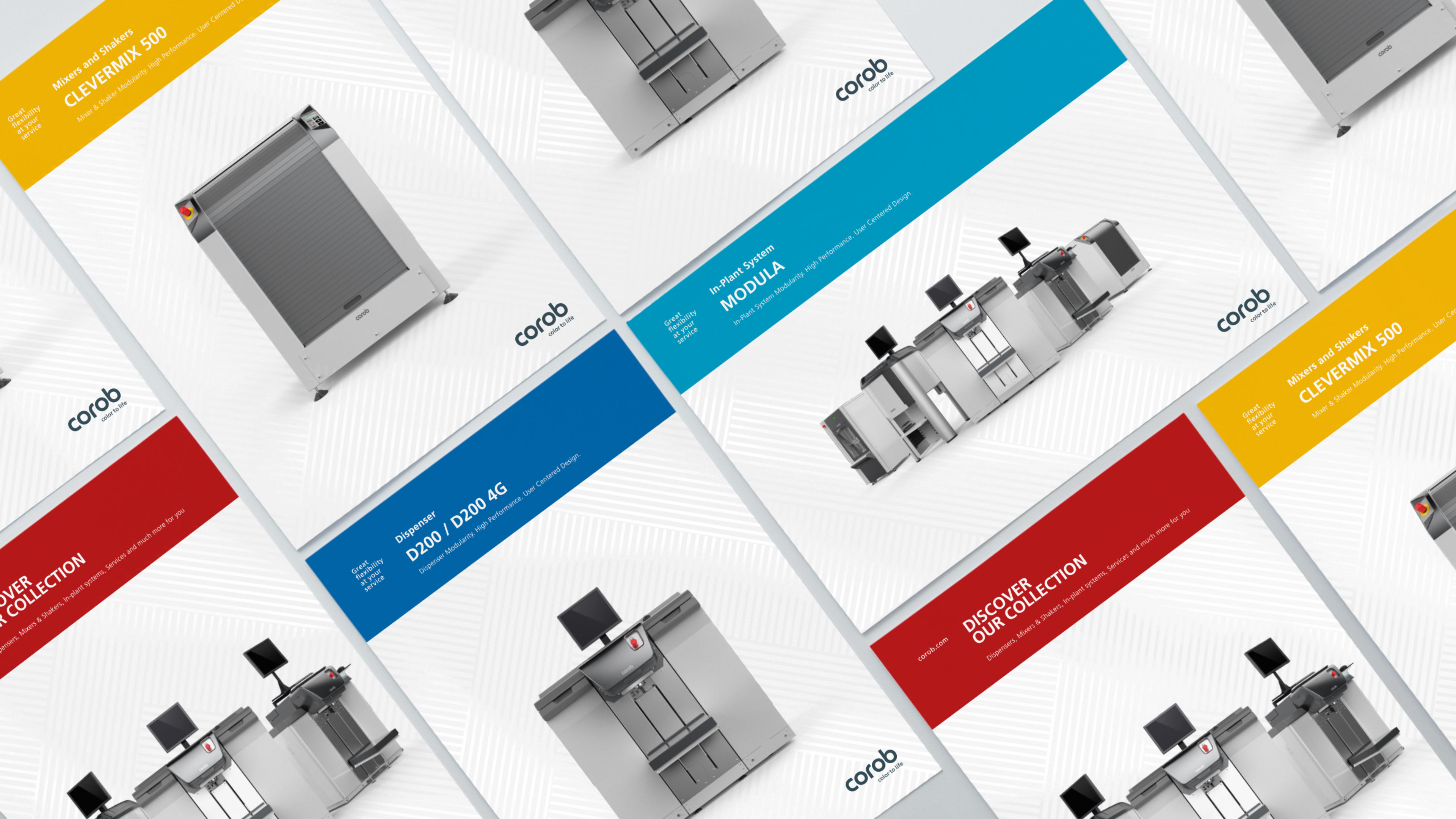 Corob, a leading Italian supplier of advanced tinting equipment for the global paint and coating industry, was excited to expand their business potential to include the B2C market. Ushering the brand into a new generation and a previously unexplored consumer market, our multidisciplinary team conducted comprehensive global analyses to calibrate the launch with a modern and colorful look, overhauling their industrial identity. Revamping Corob’s corporate branding and logo to embrace change, we helped present a company that works closely with clients to bring color to life.