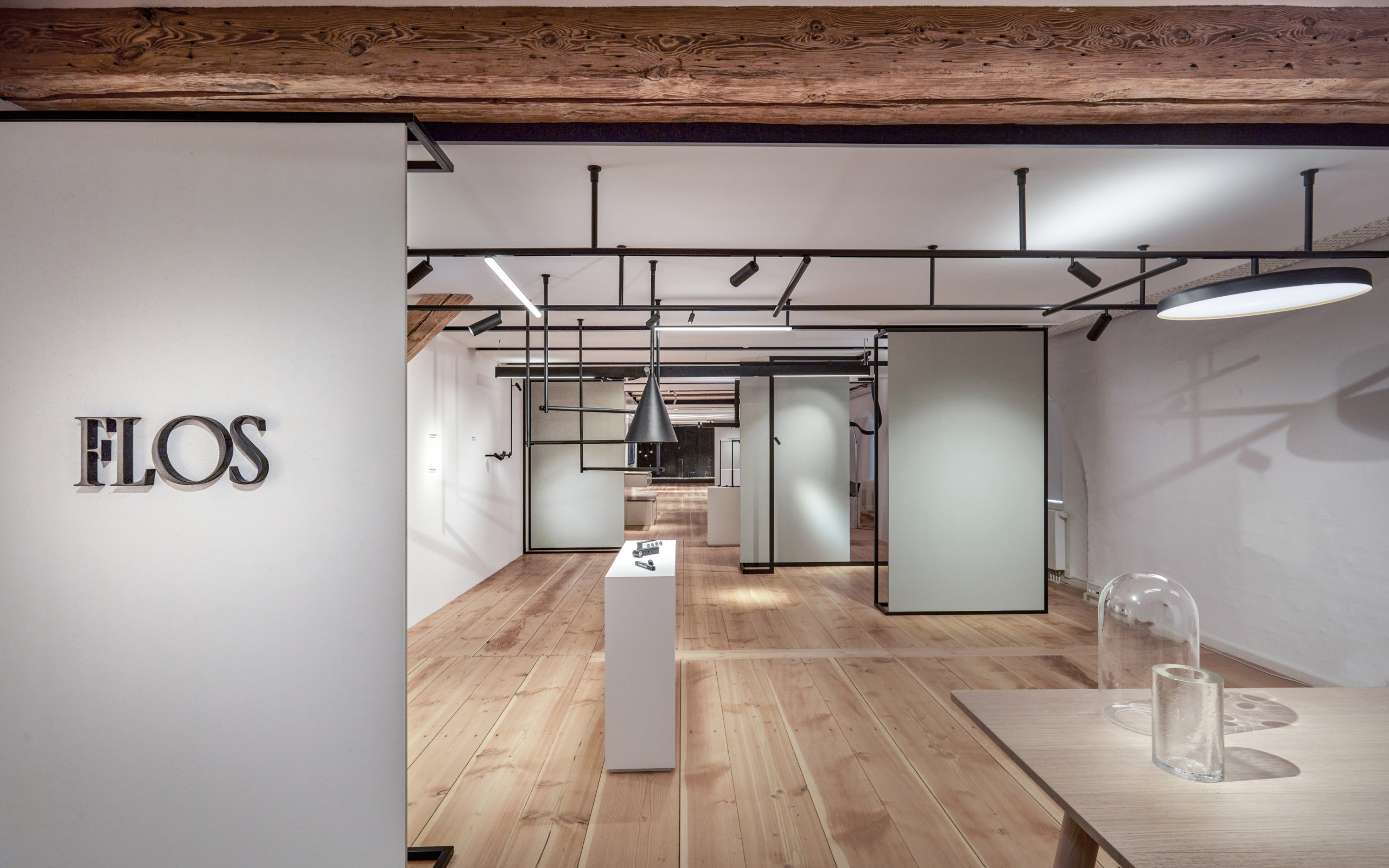 The other half of the showroom is dedicated to the iconic design of Flos. A simple, modular system that introduces colour to best emphasize the products.