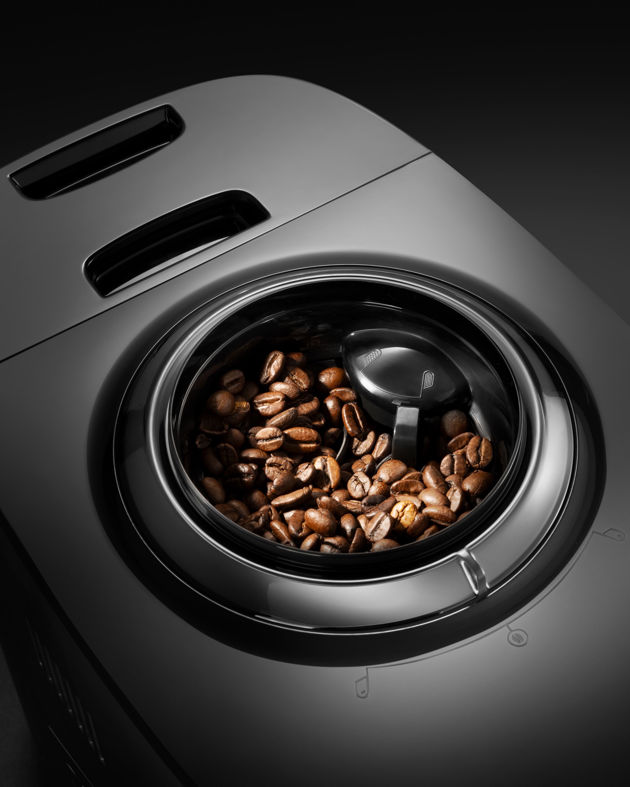 The process — contained within the compactness of a domestic machine — is emphasized through the transparent grinder and the subtle light ring that comes to life during use.