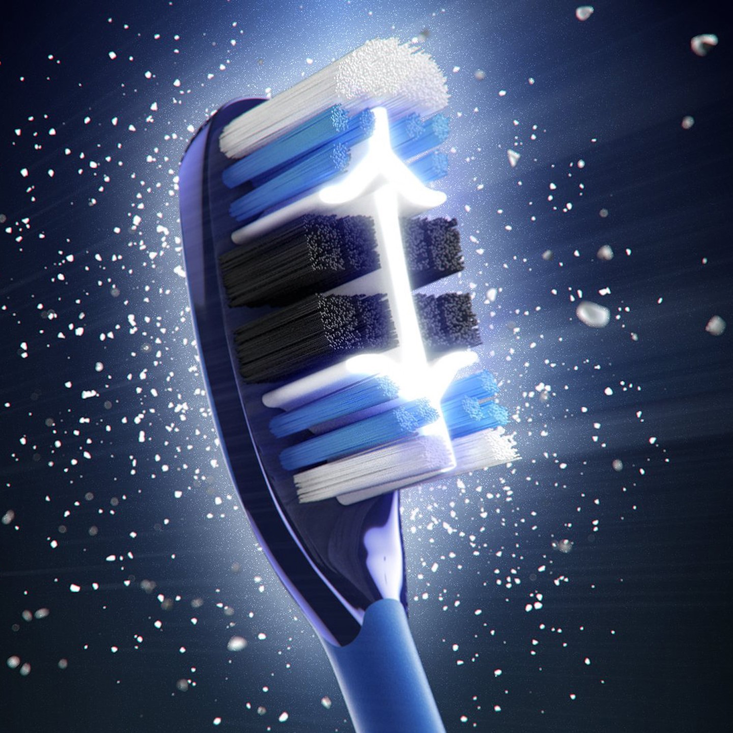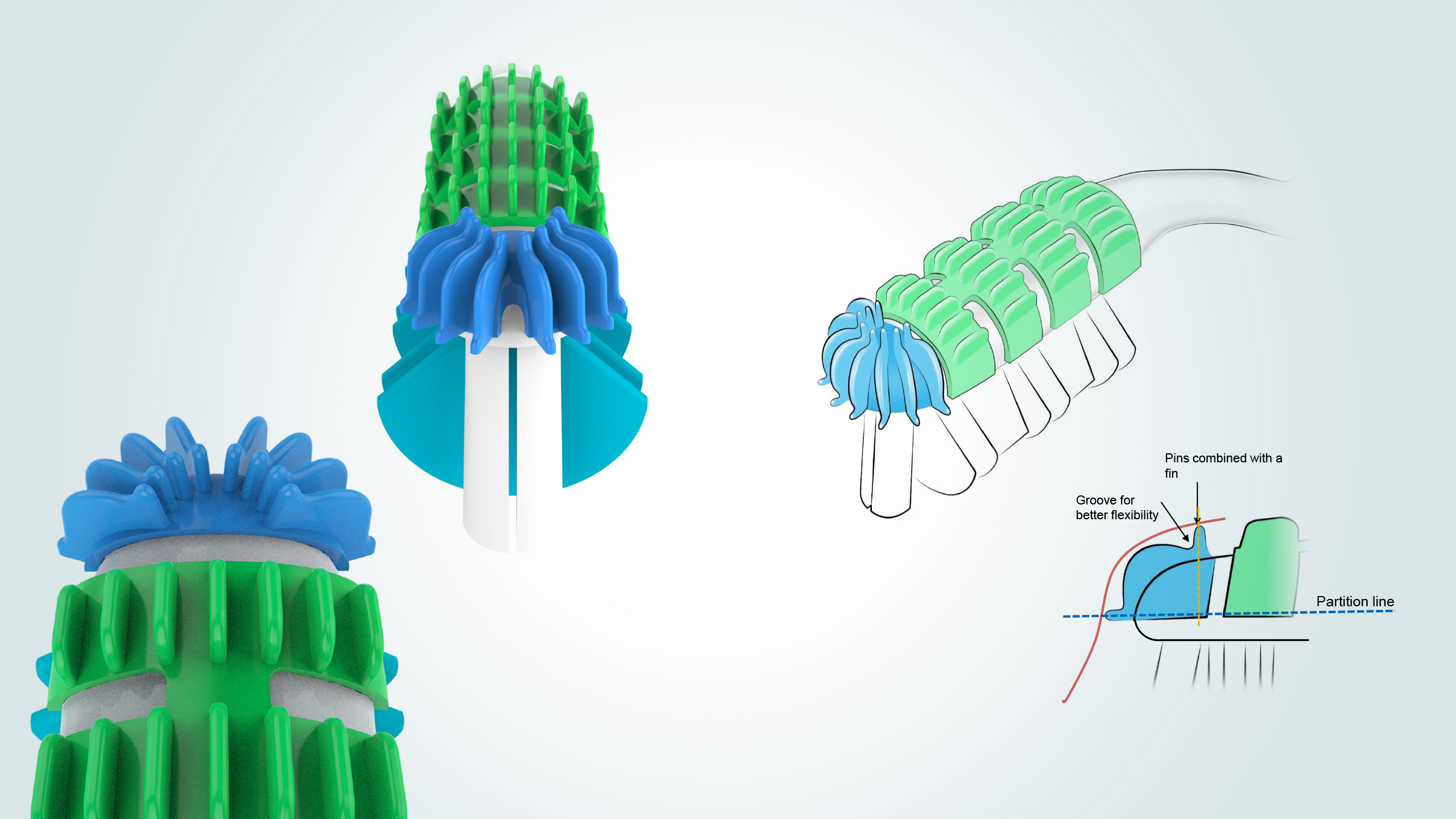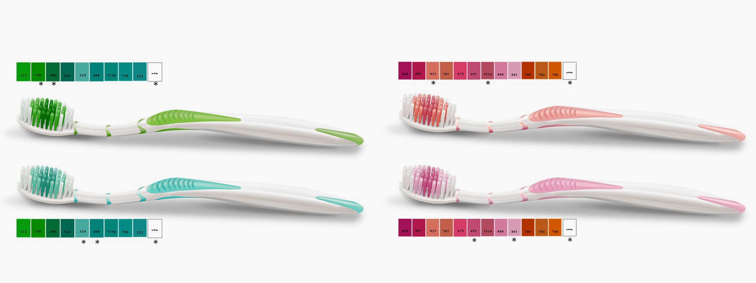 There were two specific features for the product design: the head of the toothbrush introduces a new design for the rubber lamella, that facilitates the cleaning of the teeth. The bristles feature black carbon filaments to increase the cleaning effect further, and a distinct color pattern for a dynamic feel.